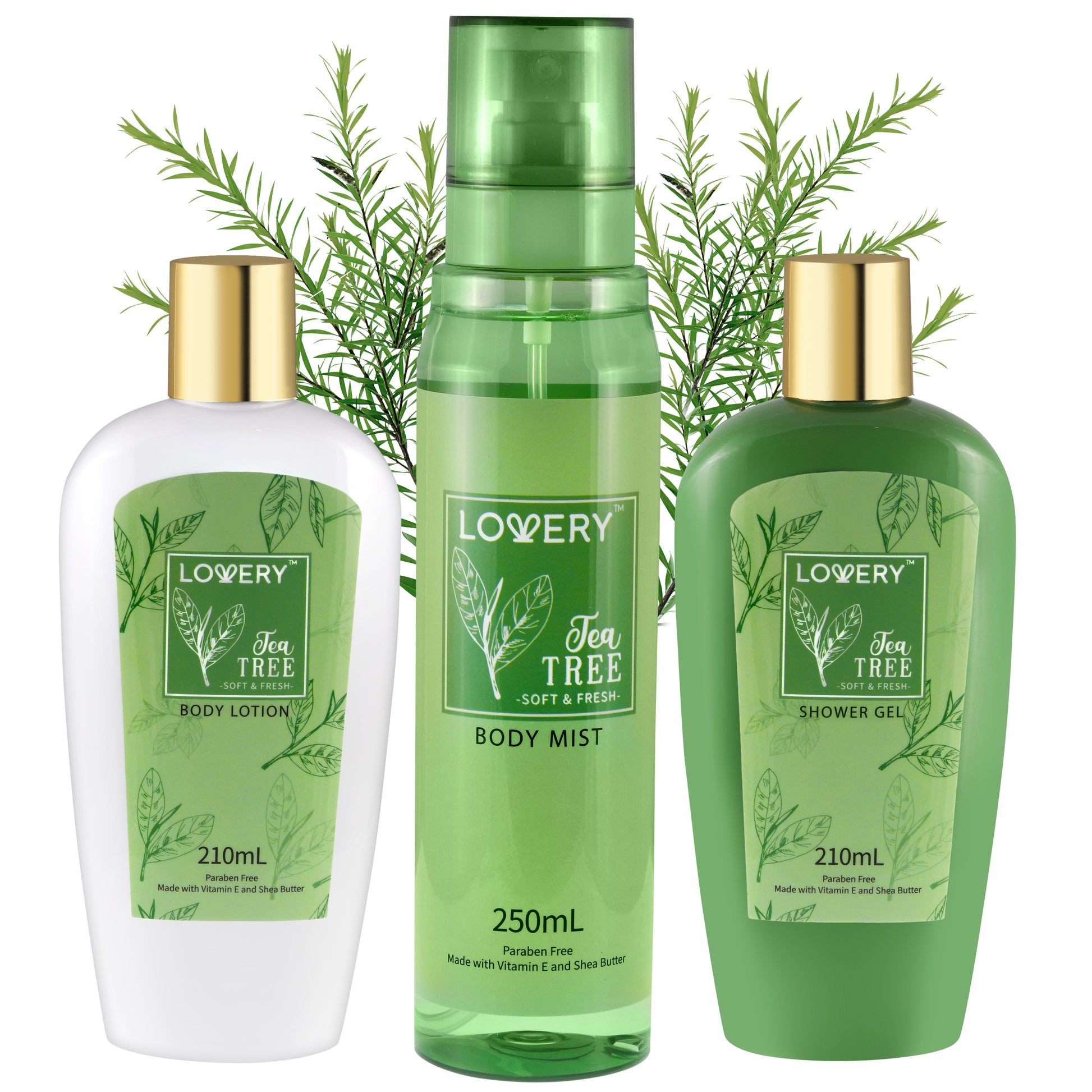 Our Tea Tree Set creates a complete self-care package for Women, Men and Teens. It is formulated with all-natural ingredients, with Vitamin E and Shea Butter, which leaves your skin luxuriously scented, smooth, and hydrated. It also helps prevent dryness and flakiness and keeps skin moisturized and supple. Every Lovery product is 100% Paraben and Cruelty-Free.